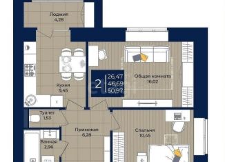 Двухкомнатная квартира на продажу, 51 м2, улица Луначарского, 83