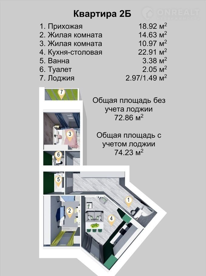 Общая площадь 74.1 м2