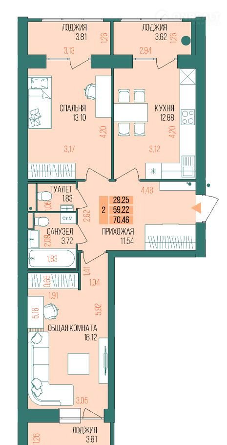 Общая площадь 70.5 м2