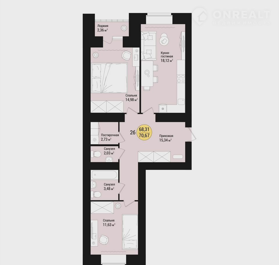 Общая площадь 70.7 м2