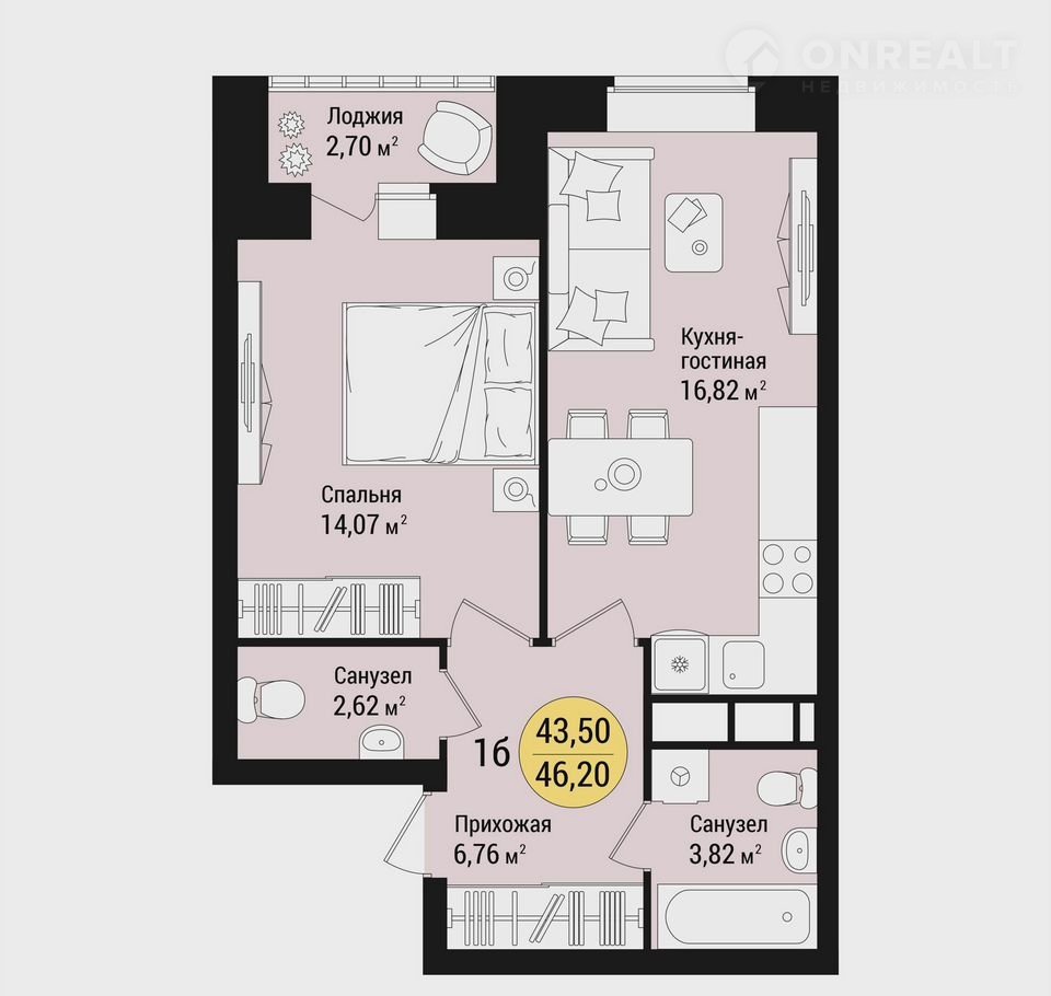 1-комнатная квартира, 46.2 м2, этаж 7 / 16, на продажу в Йошкар-Оле