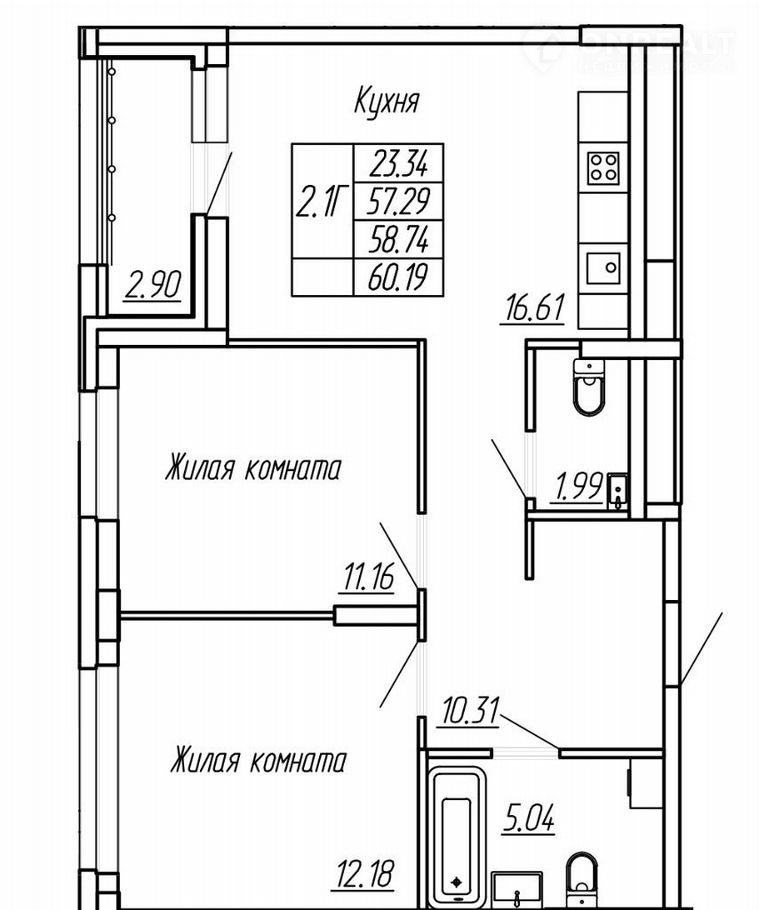 Общая площадь 58.7 м2