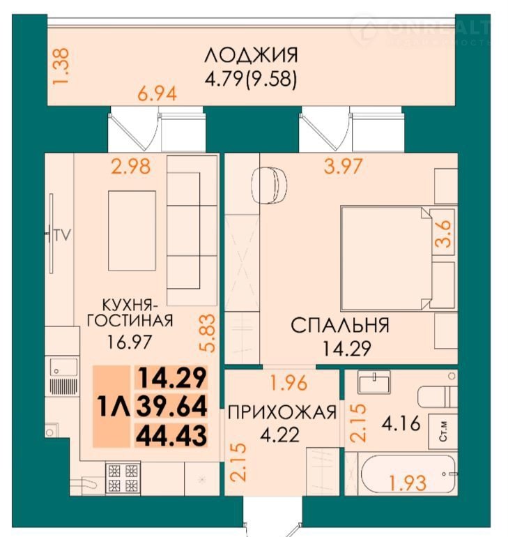 Площадь — 44,5 м²