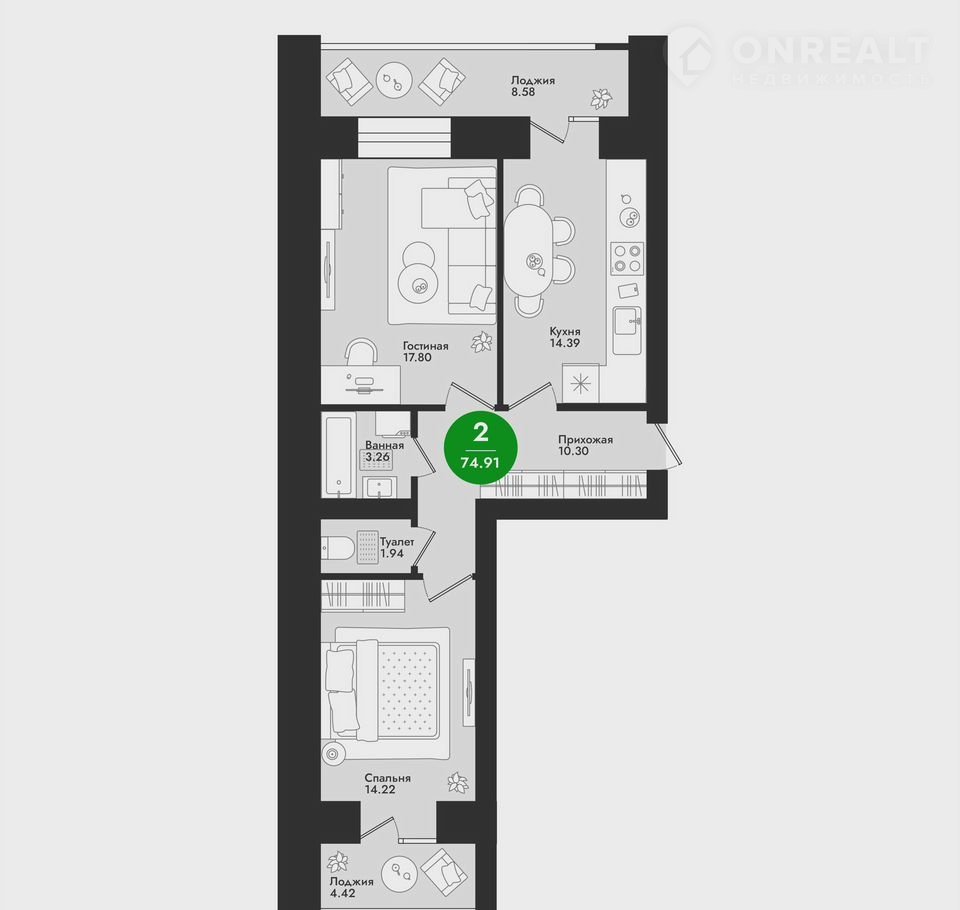 Общая площадь 74.9 м2