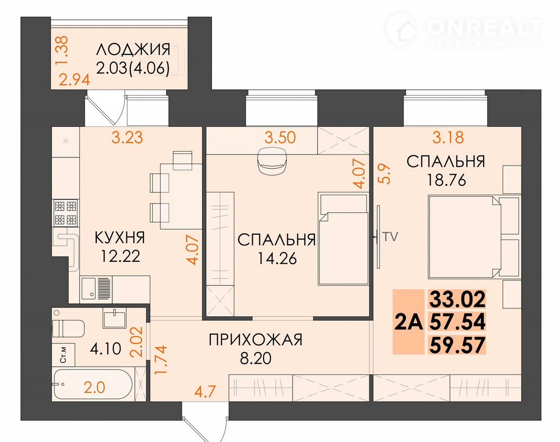 Общая площадь 59.5 м2