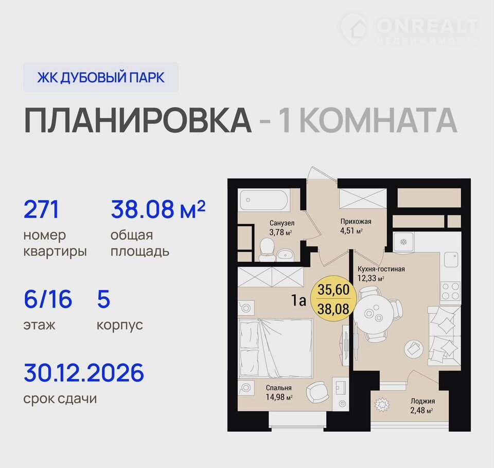 1-комнатная квартира, 38.1 м2, этаж 6 / 16, на продажу в Йошкар-Оле