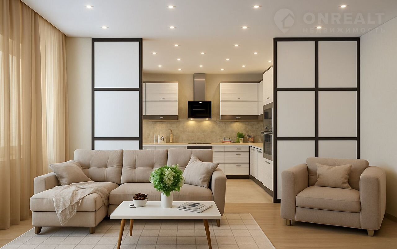 — Кухня-гостиная отделена раздвижной перегородкой — готовите в тишине или объединяете для праздника