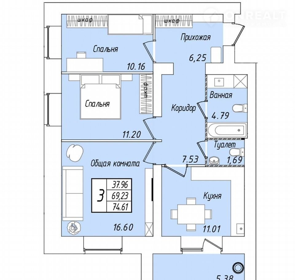Общая площадь 74.6 м2