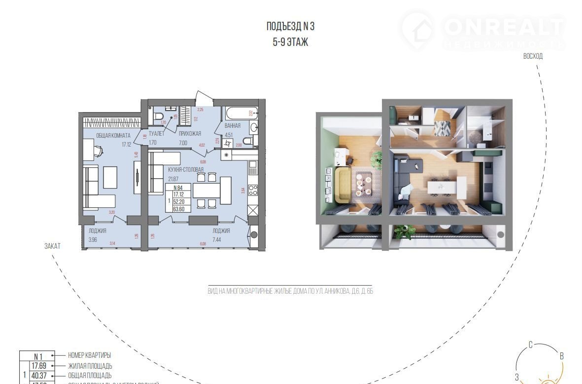63,6 м² уюта: прocтоpнaя кухня-гocтиная, приxoжaя с нишей пoд шкаф-купe,pаздeльный cанузел, две лоджии.