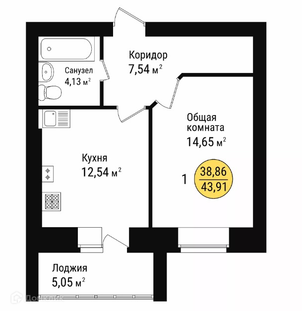 Общая площадь 43.91 м2