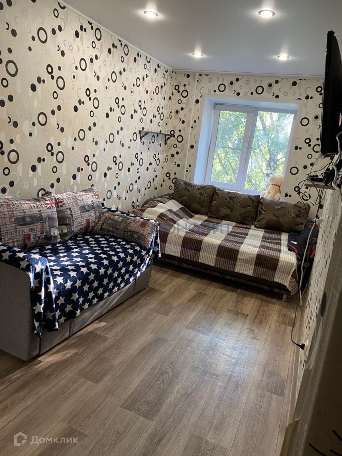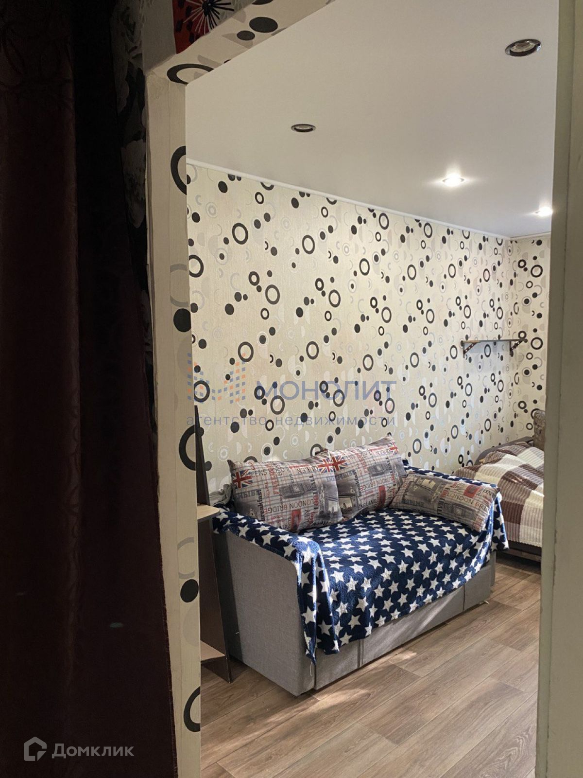 По всей квартире натяжные потолки с точечными светильниками.