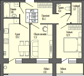 Общая площадь 54.89 м2