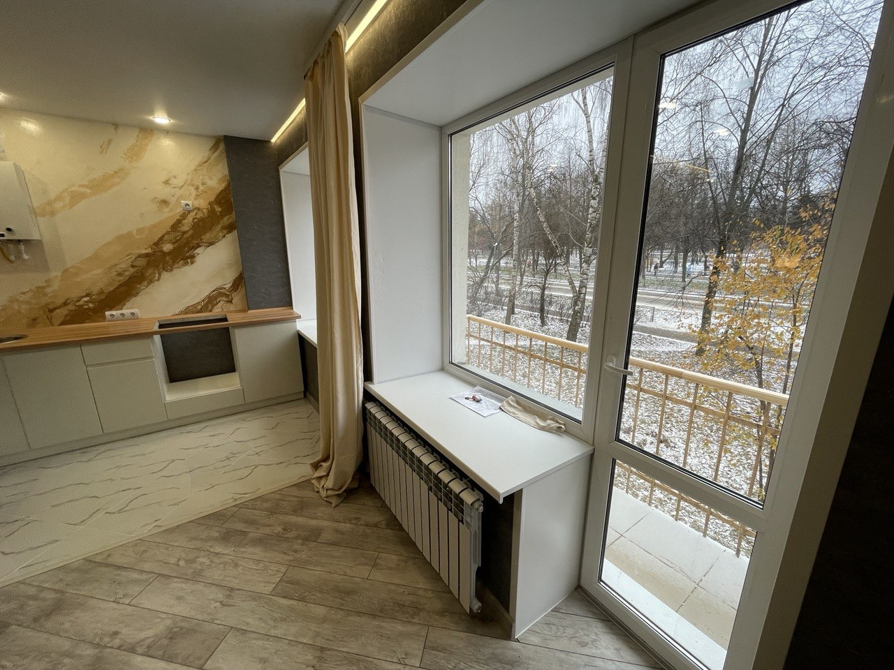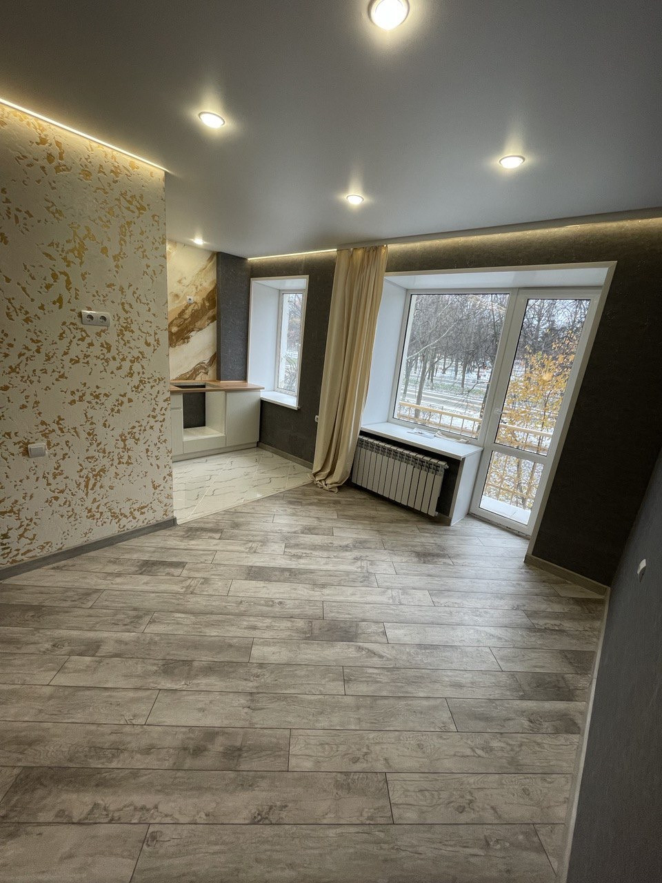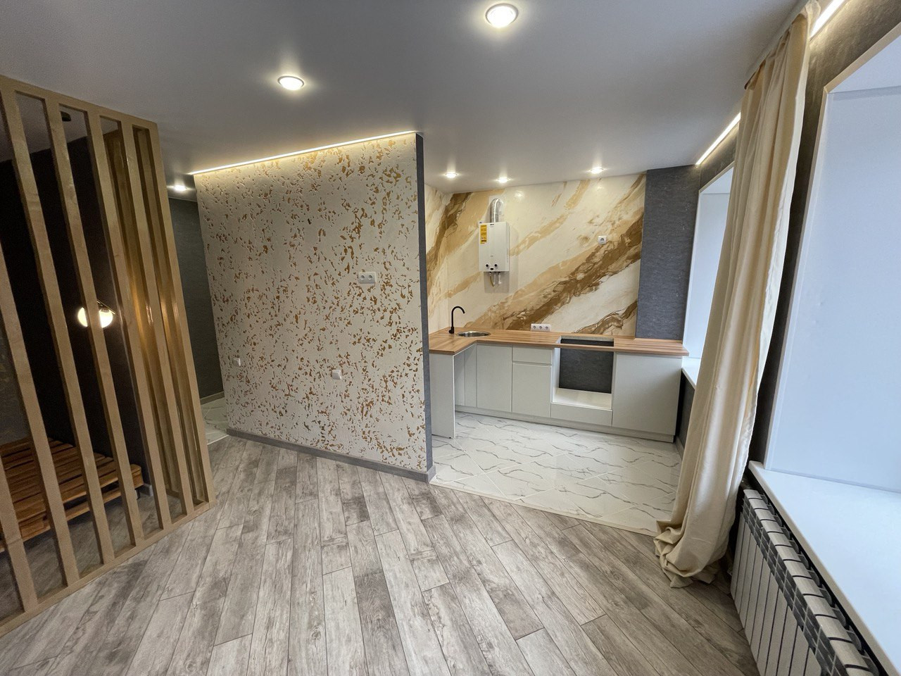 Абсолютно новый ремонт, никто не жил, качественные отделочные материалы, зал ламинат, кухня, прихожая, санузел-плитка, декорации с подсветками, абсолютно новая электрика, сантехника, батареи, окна, газовая колонка, очень чистый подъезд, хорошие, тихие соседи, во дворе чисто, нет луж. Срочная продажа.