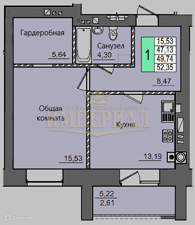 Общая площадь 52.35 м2