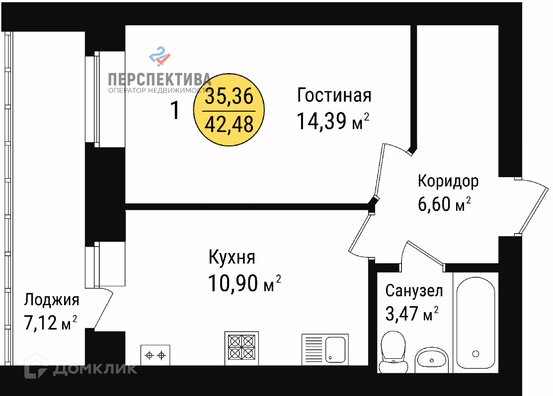 Общая площадь 42.5 м2