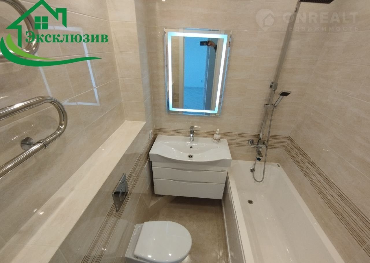 Санузел совмещен с ванной комнатой. Отличный ремонт, всё в современном кафеле светло-бежевых тонов.