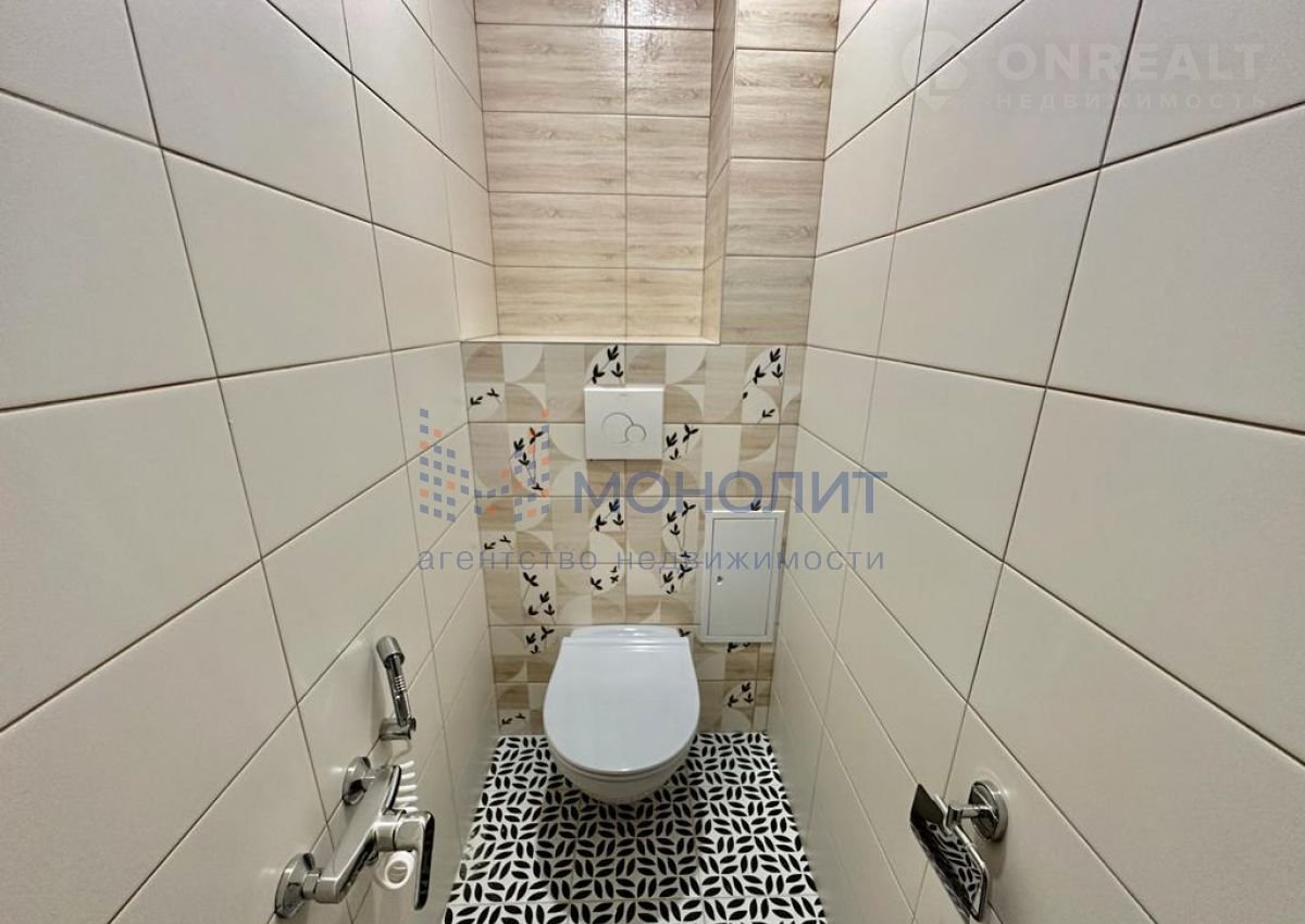 Раздельный санузел отделан современным кафелем в светлом оттенке.