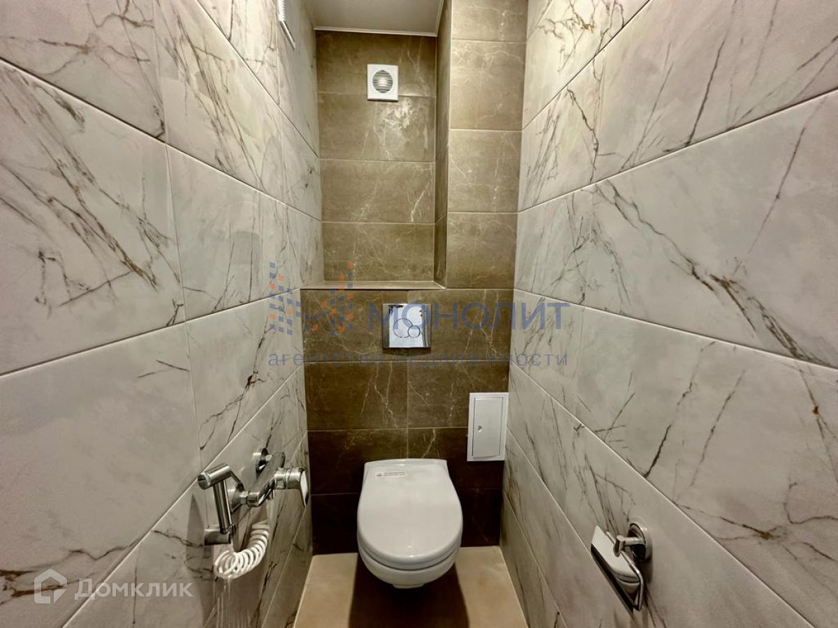 Раздельный санузел отделан современным кафелем в светлом оттенке.