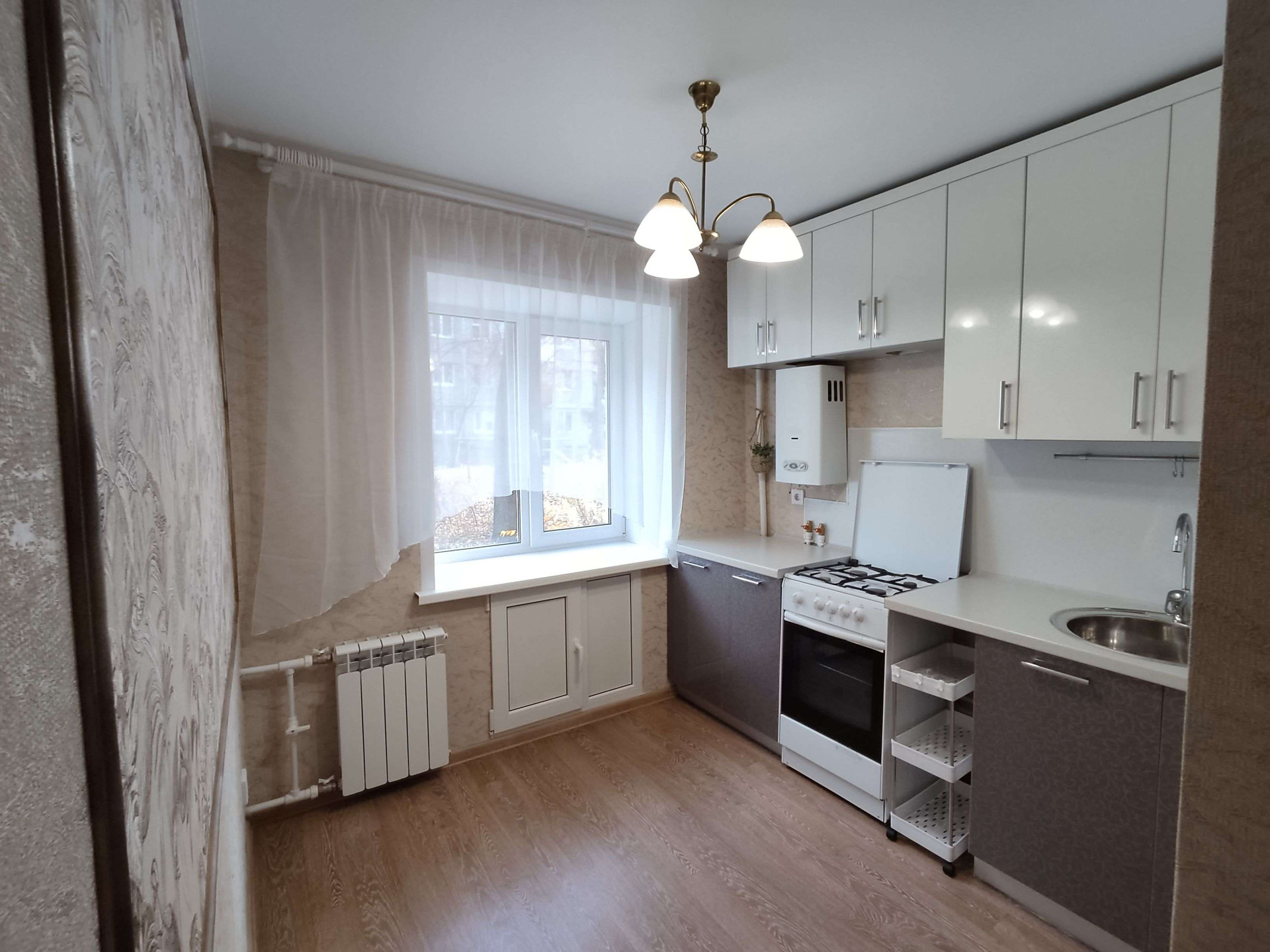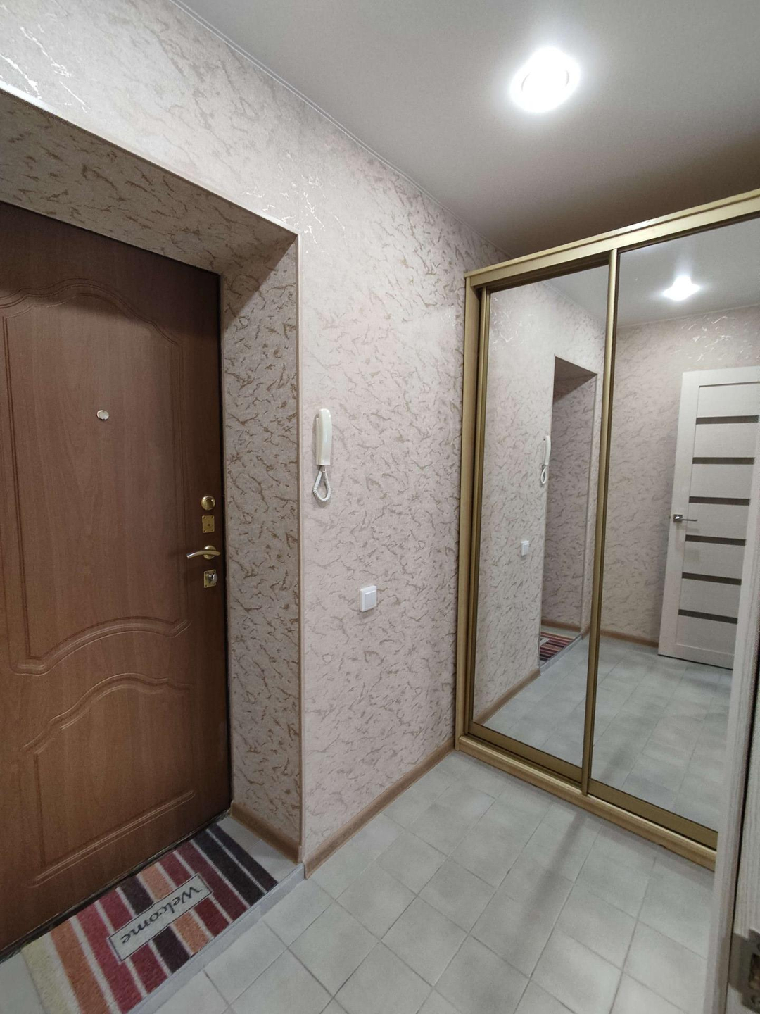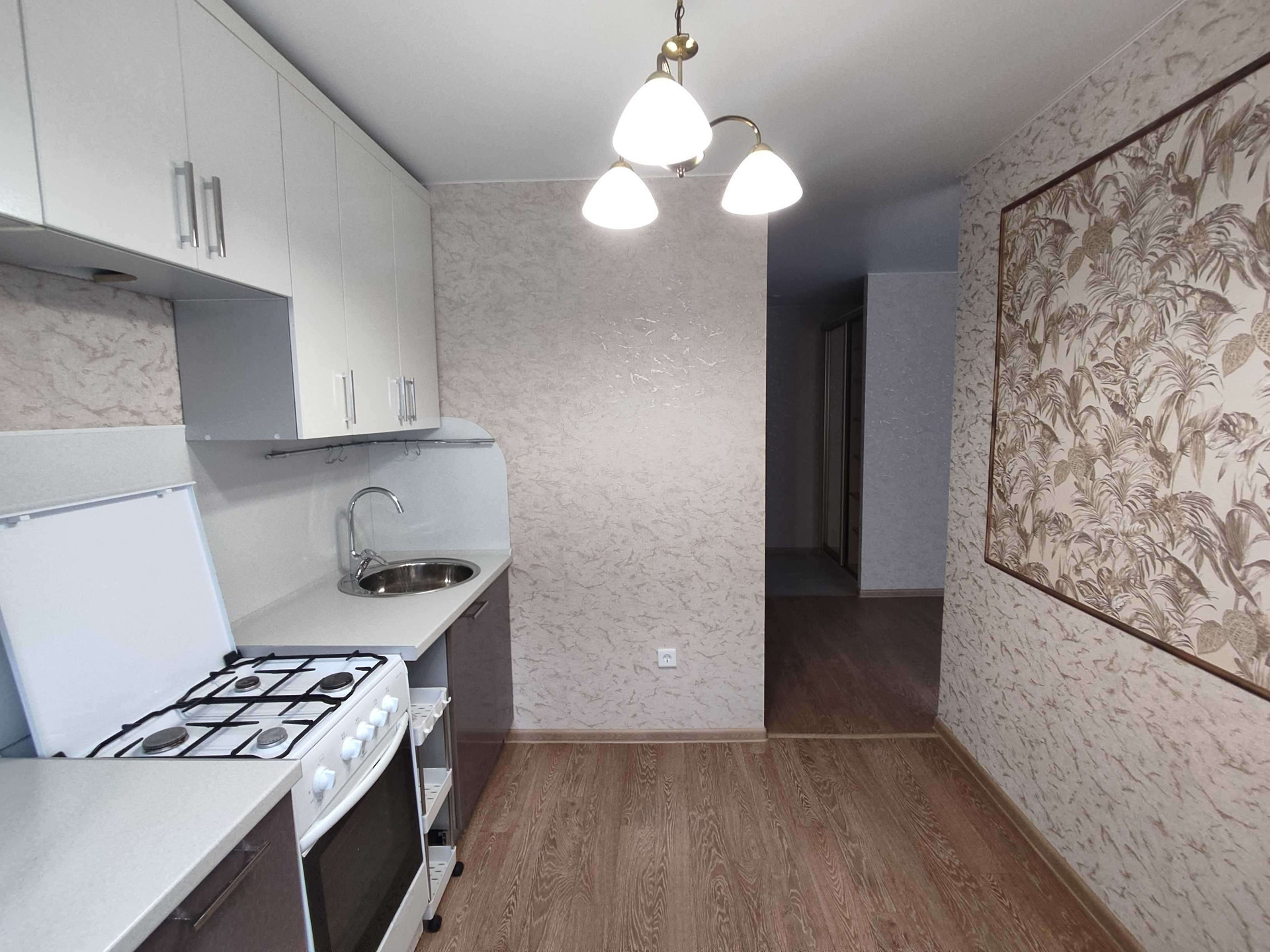 Новым хозяевам остаётся вместительный шкаф-купе в прихожей, шкафчики в с/у, кухонный гарнитур.