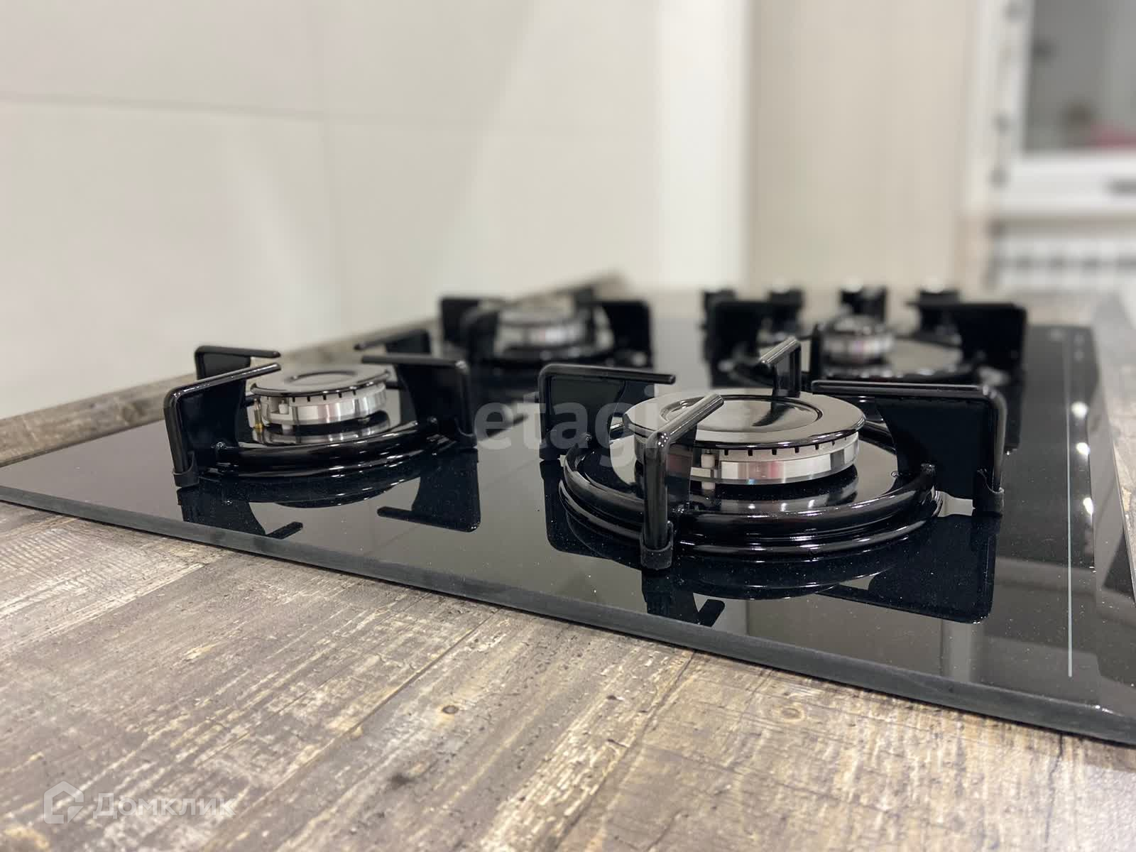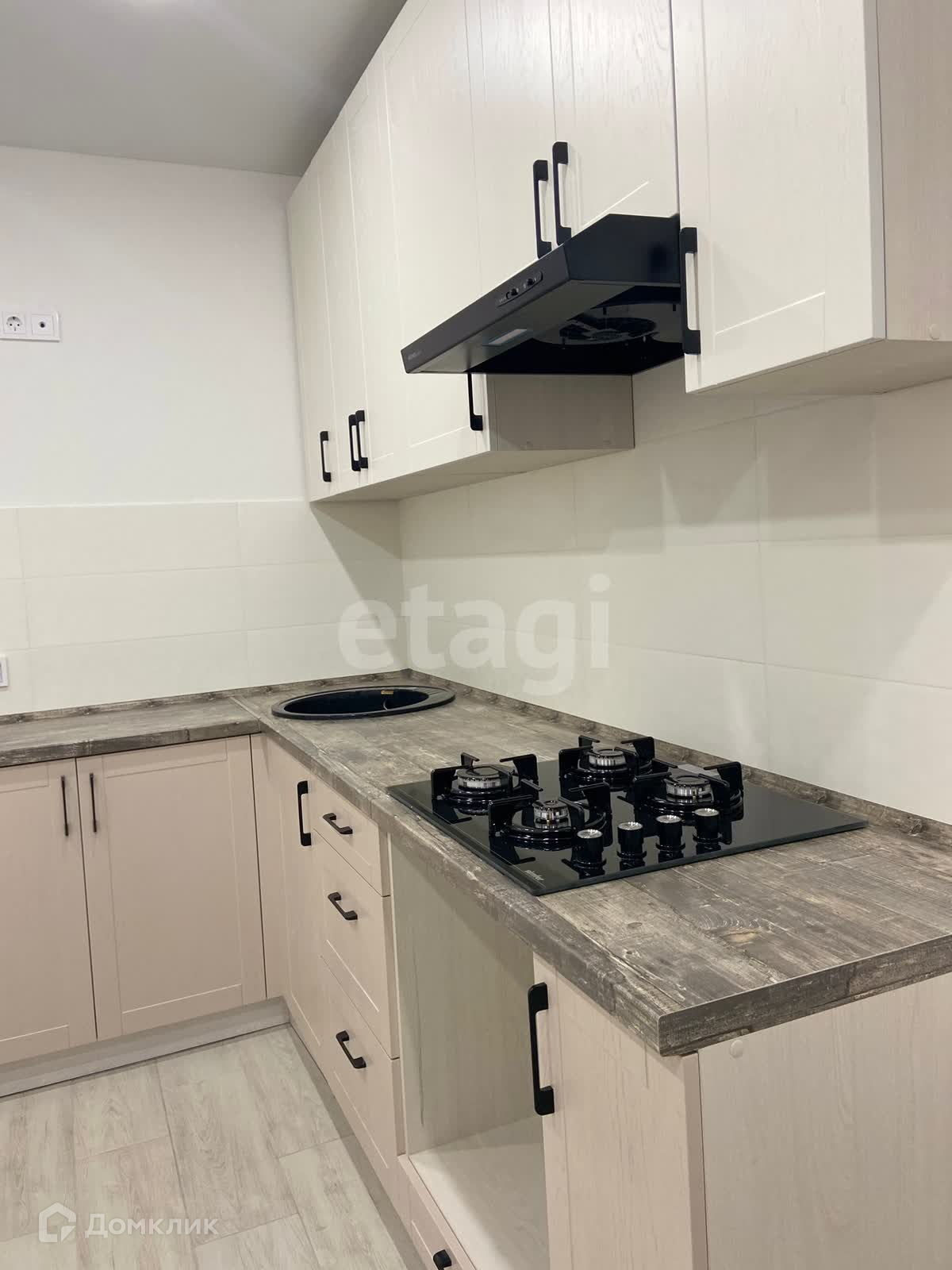 На кухне установлен кухонный гарнитур, варочная панель и вытяжка.