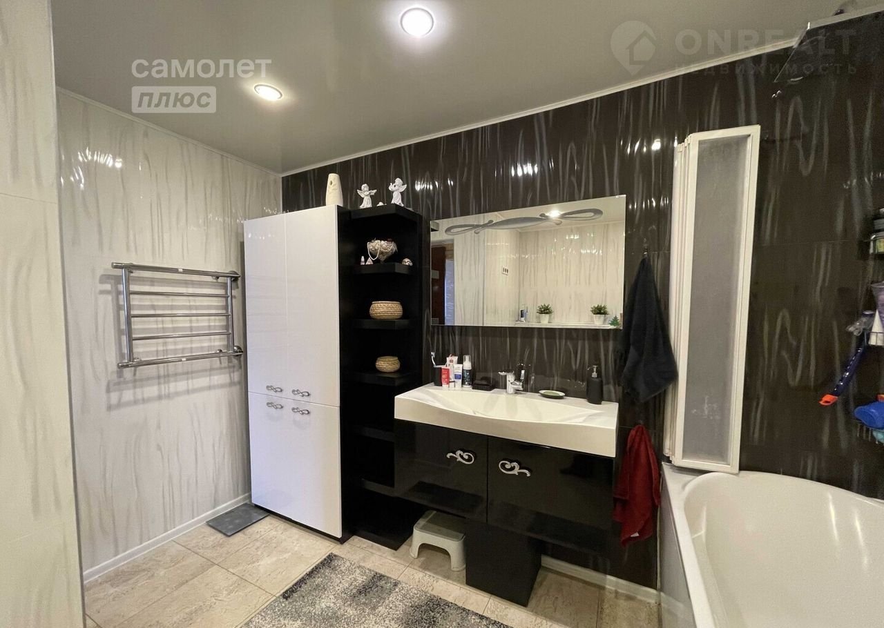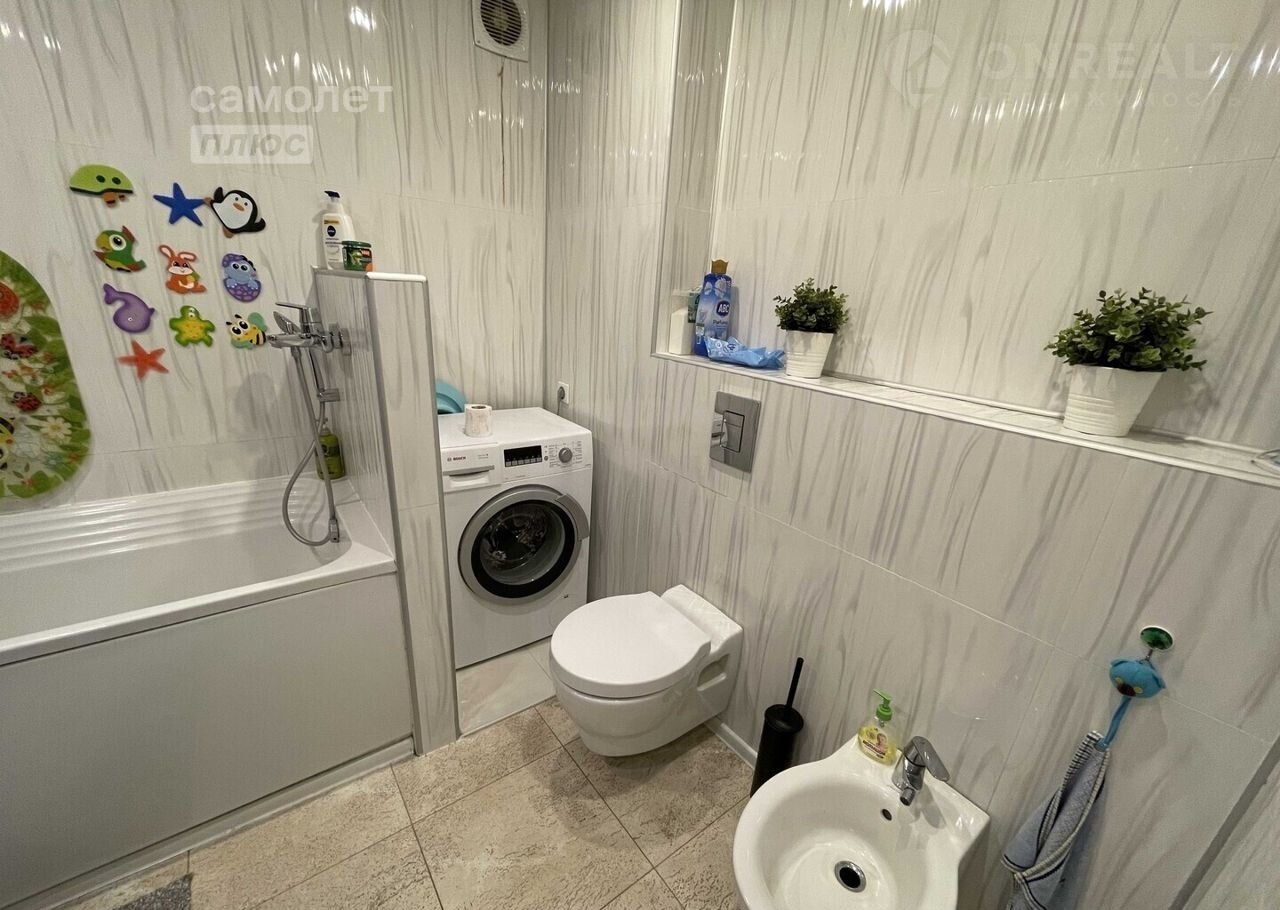 — Большое пространство, где легко разместилась ванная, раковина с тумбой, дополнительные места для хранения, место для стиральной машины.