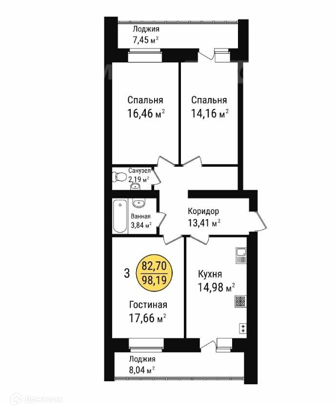 Агентство недвижимости, самолёт плюс предлагает трёхкомнатную квартиру в сданном доме.