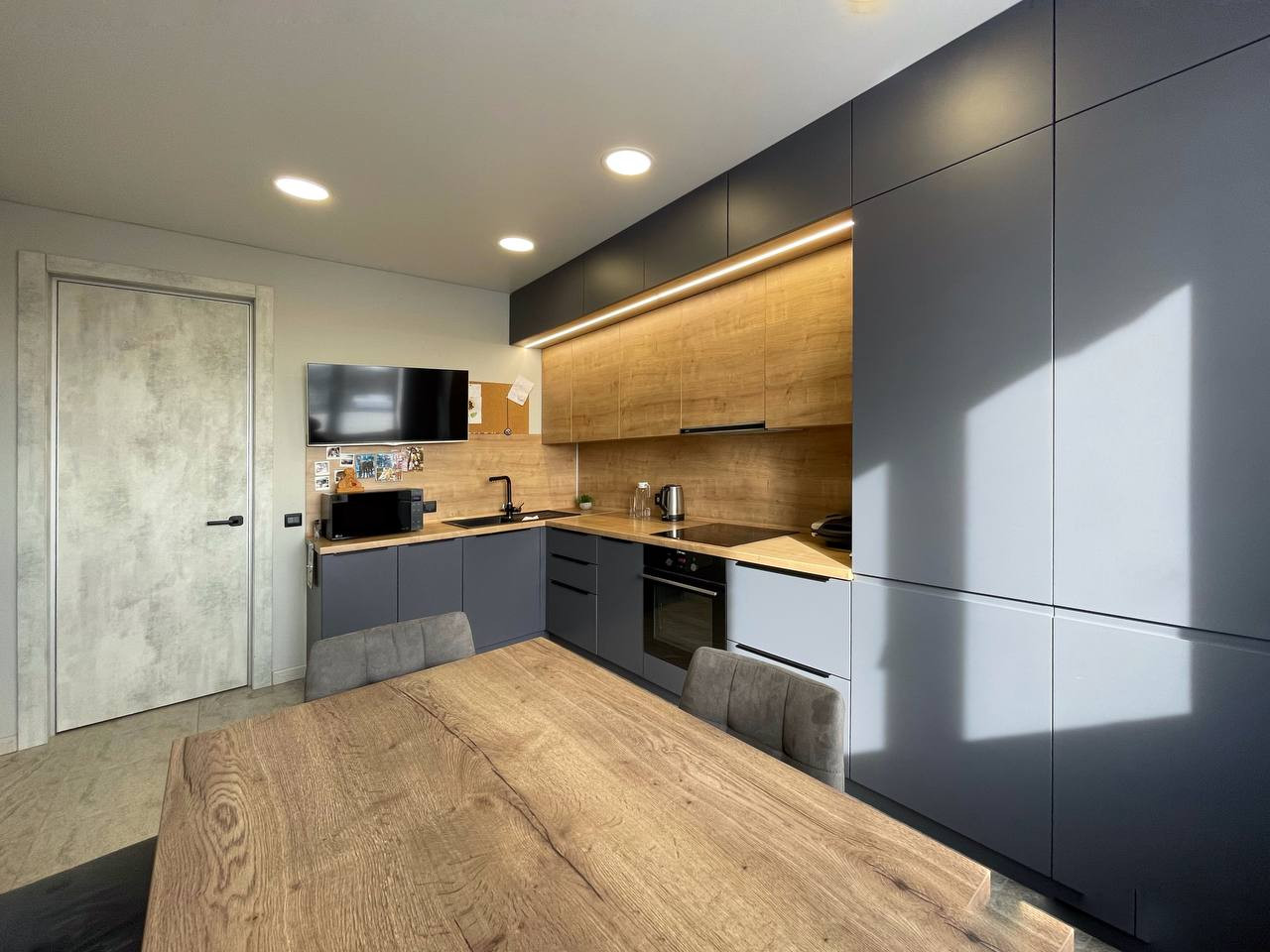 - В квартире остается вся, встраиваемая, мебель и техника: Индукционная плита и духовой шкаф Hansa, немецкая вытяжная система Krona и посудомоечная машина.
