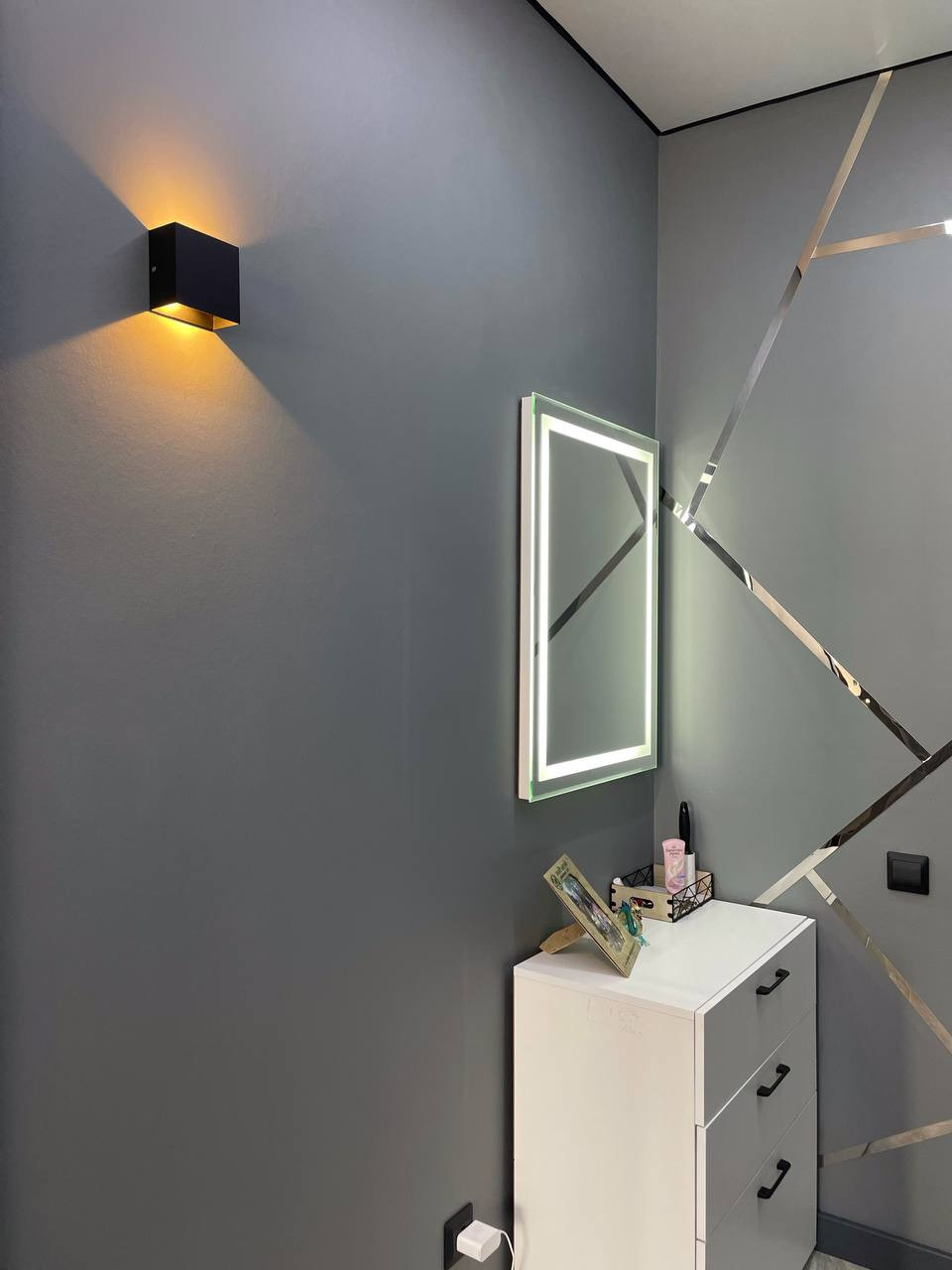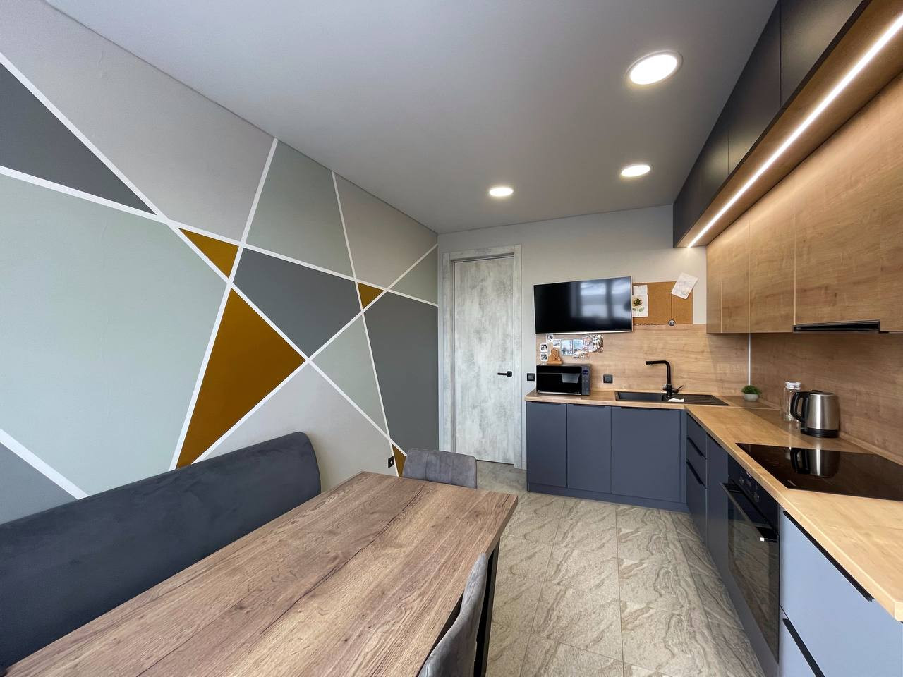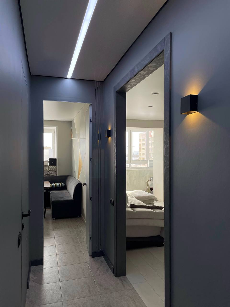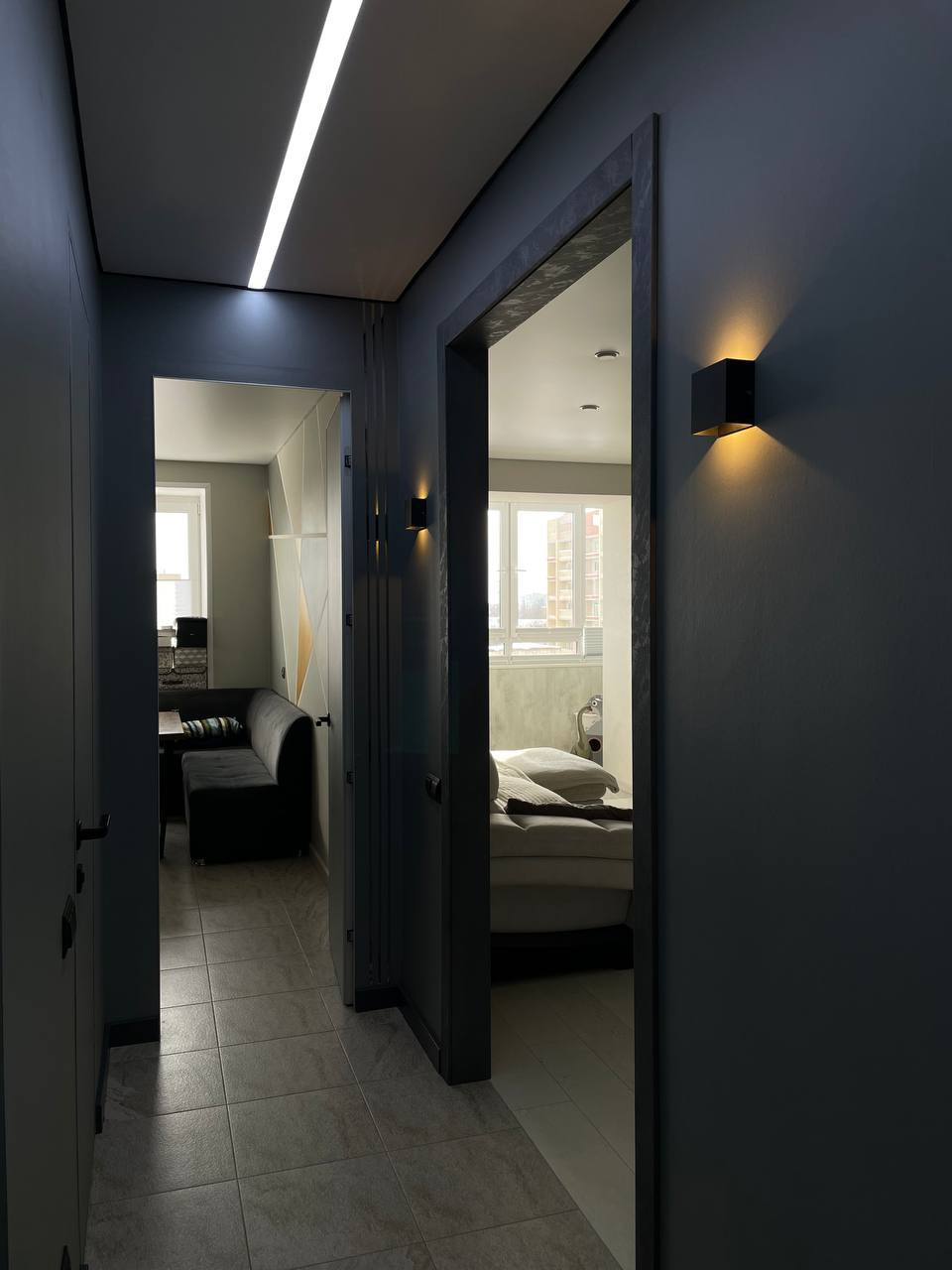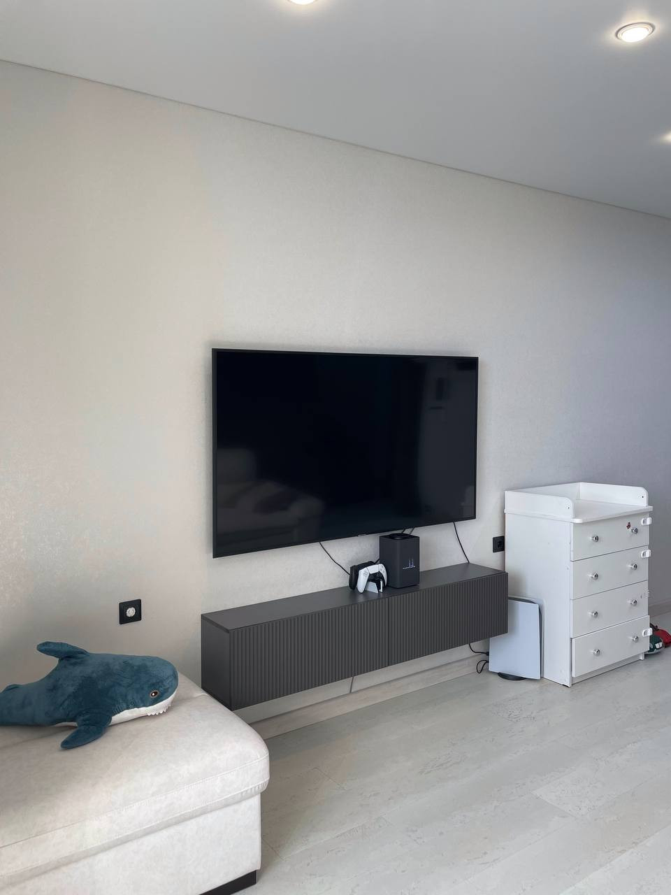 - Выведен доступ по всей квартире для дополнительного освещения, вплоть до освещения полок в санузле, полок в гардеробной ниши, розеток, и люстр и точечного освещения на кухне и в комнате. И всё это не требует демонтажа отделочных работ.