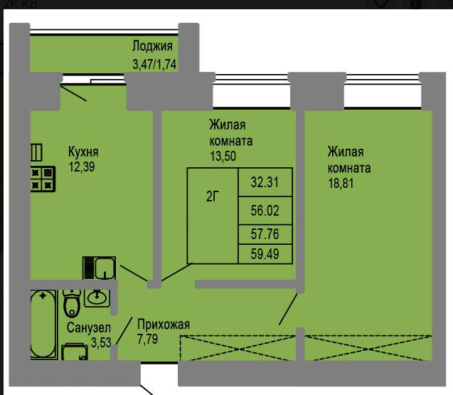 Общая площадь 57.76 м2