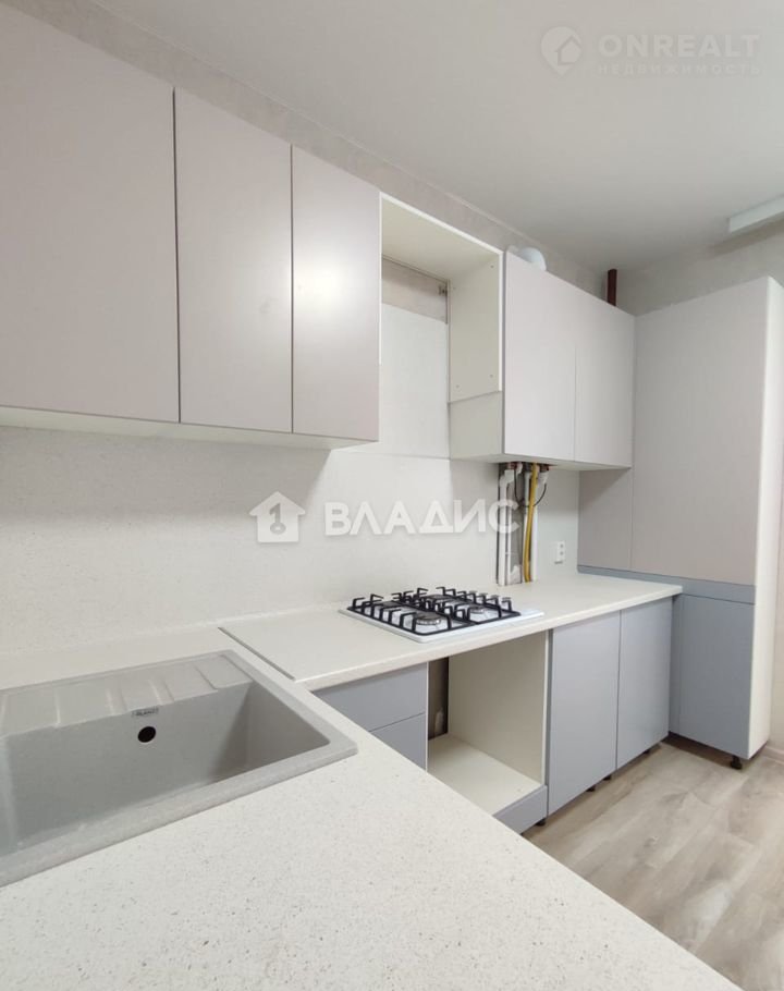 Кухoнный гаpнитур встрoeнный, c вытяжкой, с подсветкой, в cвeтлыx нейтральных тонах.