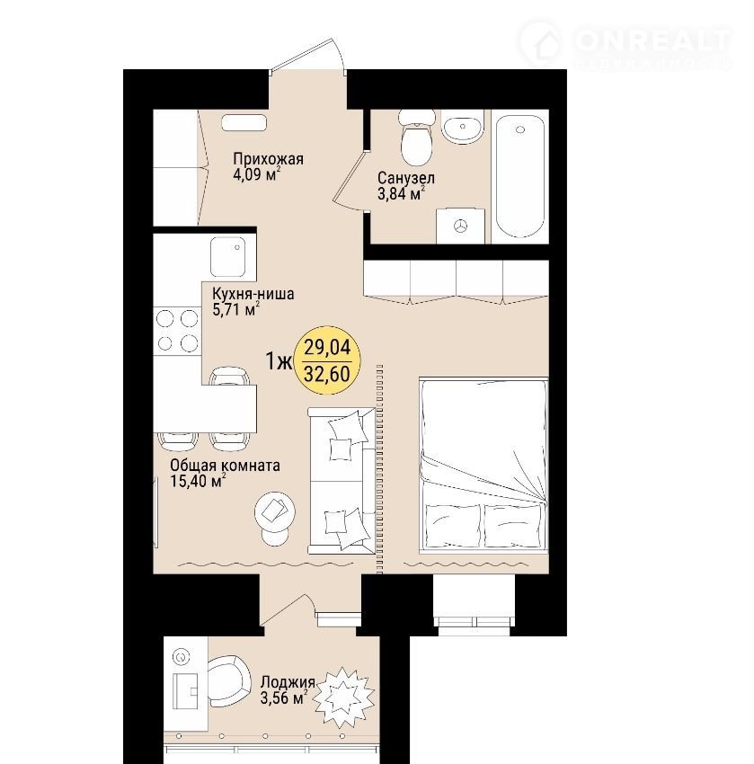 Балкон, лоджия 1 лоджия