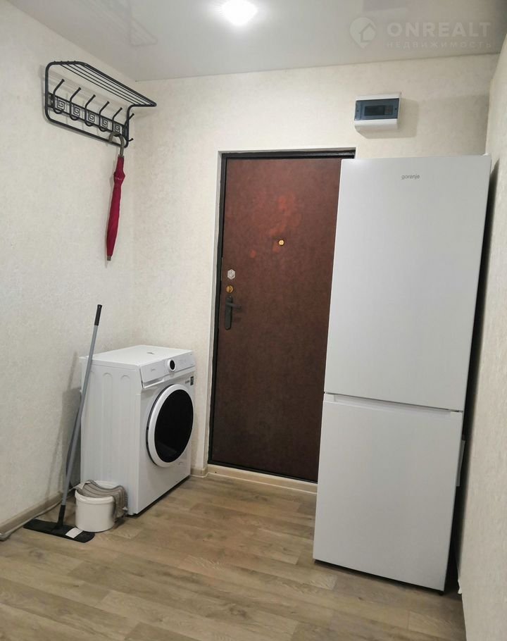 В комнате есть вся необходимая мебель и техника: Стиральная машина, холодильник, двухспальная кровать, места для хранения, микроволновая печь и электрическая плитка.