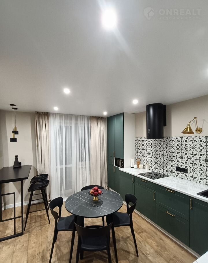 современная встроенная кухня, круглый стол, удобные анатомические стулья,посуда для готовки,электрический чайник, столовые приборы, кофе,чай)
