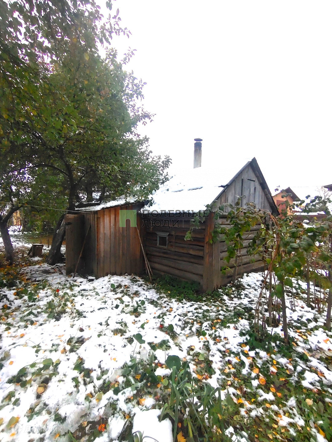 На участке стоит бревенчатая баня в рабочем состоянии. Крепкий пол и металлическая печка.