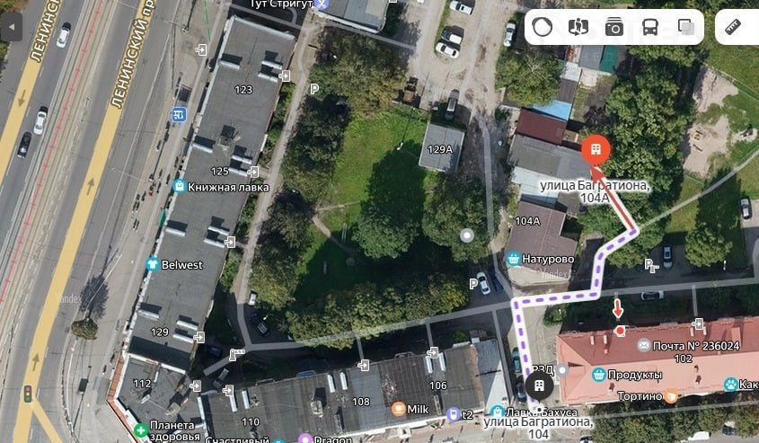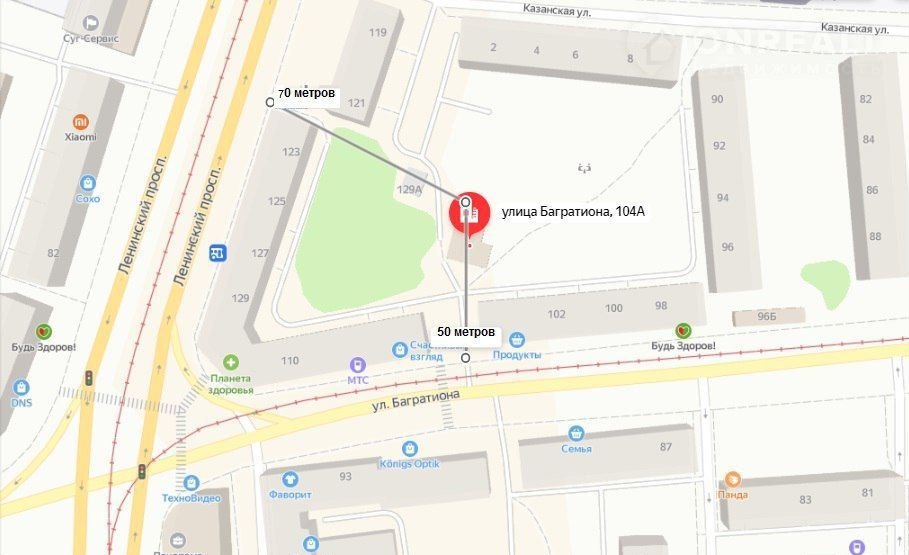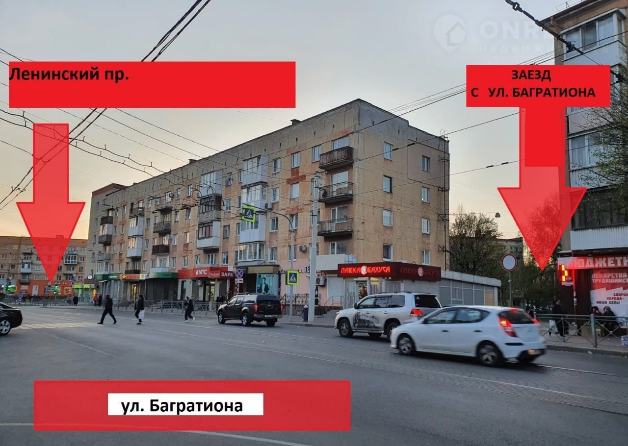 Помещение находится рядом с оживленным перекрестком с активным  автомобильным и пешеходным трафиком, во дворе рядом с гаражами (первый въезд во двор с левой стороны, если поворачивать с Ленинского пр., ориентир "Лавка Бахуса" и минирынок на Багратиона. При повороте с Багратиона во двор виден магазин "Натурово", чтобы пройти к помещению магазин надо обойти с правой стороны.