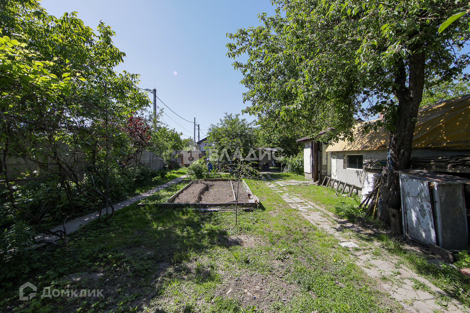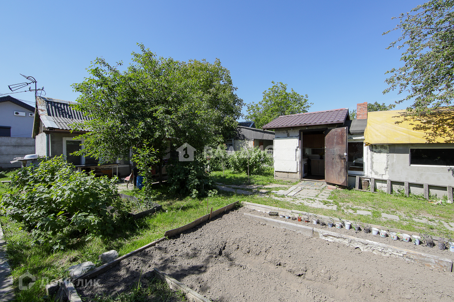 Растут 7 вишен, 1 сочная груша, раскидистый грецкий орех, множество кустов смородины и малины.