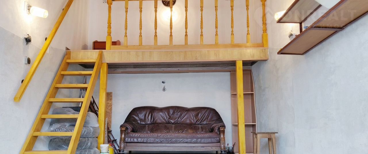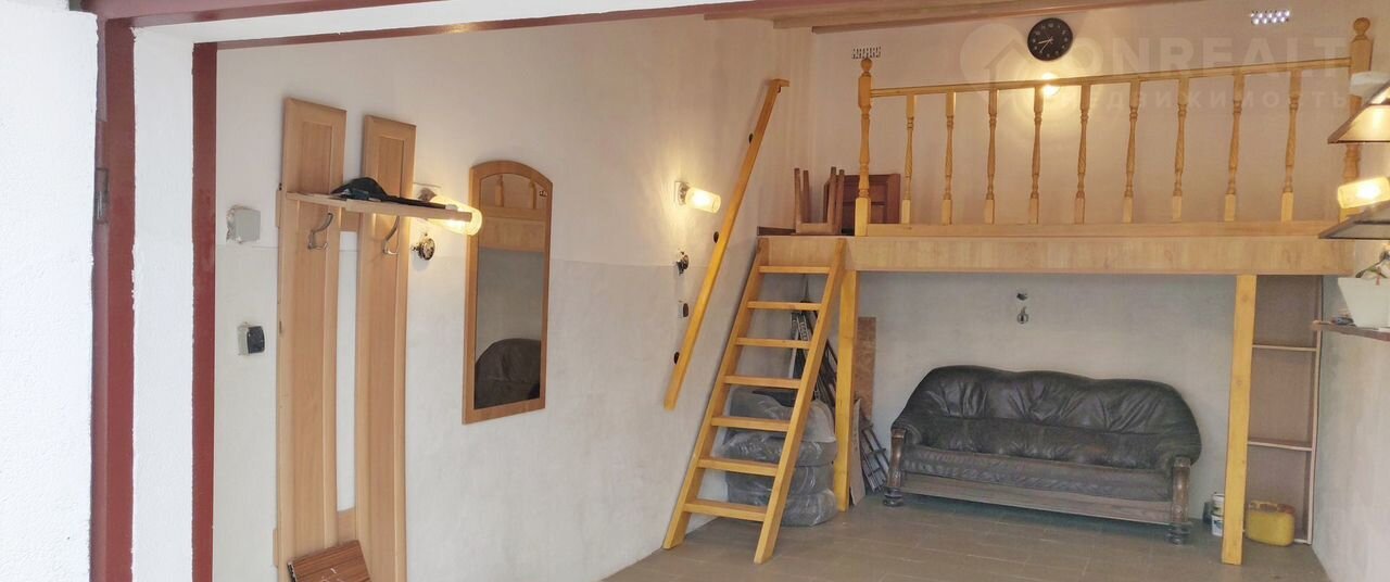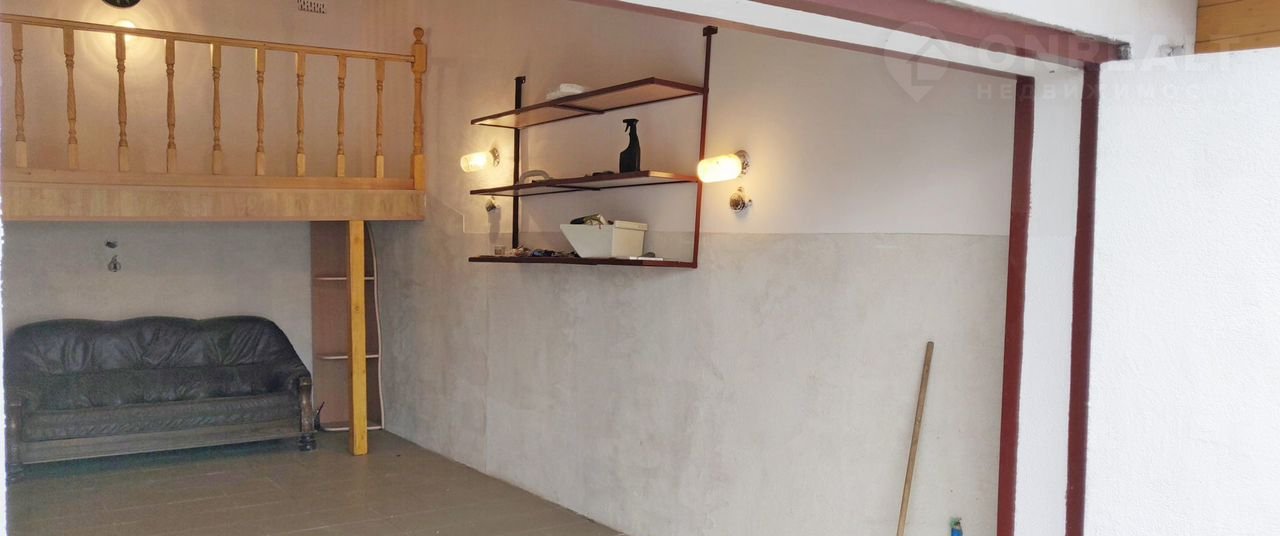 В задней части гаража установлена деревянная антресоль с лестницей - доп. пространство, где можно организовать место досуга (поставить стол, кресло или раскладушку). Под антресолью кожаный диван.
