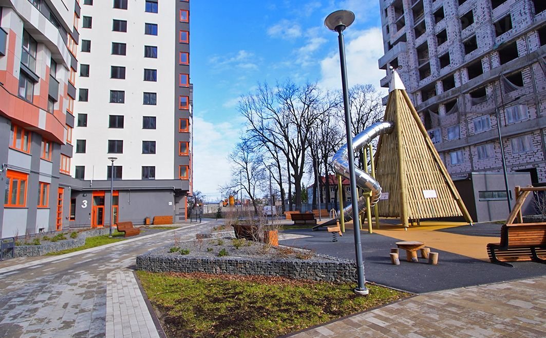 - Детская площадка с современным оборудованием, амфитеатр, велосипедные парковки. Каждая секция жилого комплекса оснащена двумя лифтами и помещением для хранения детских колясок.