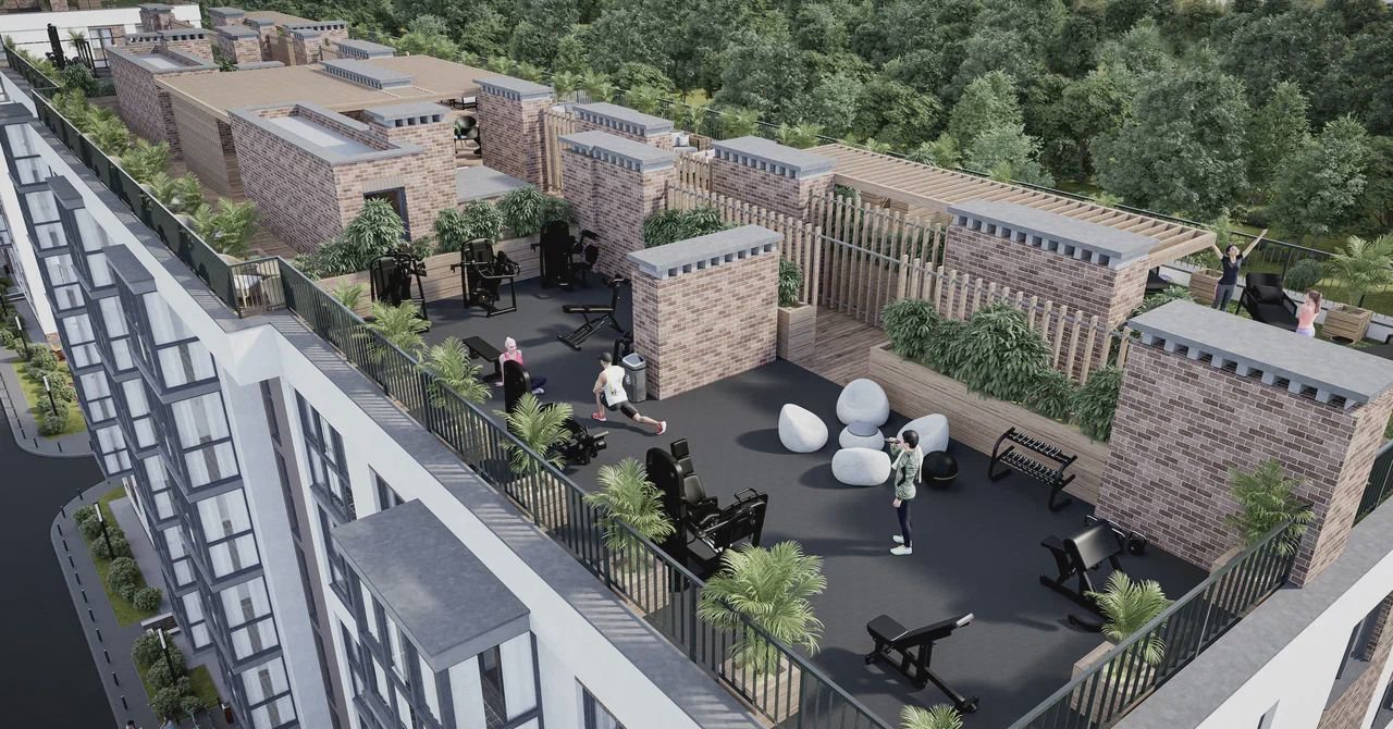 На обитаемой кровле нашего дома расположены зоны для занятия спортом и отдыхом:
