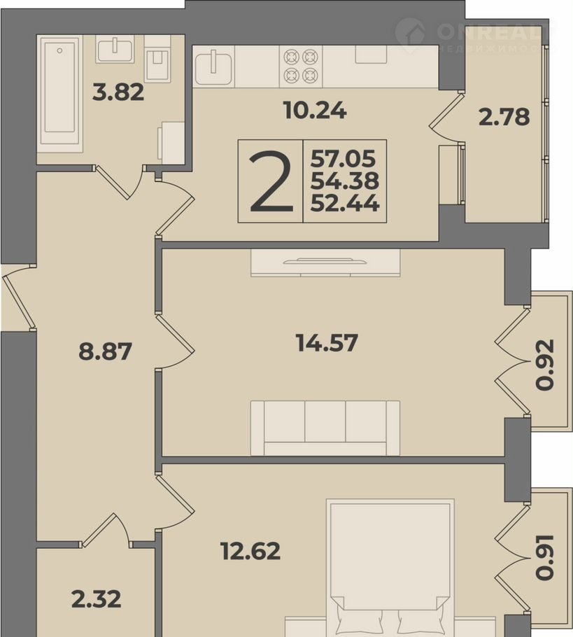 2-комнатная квартира, 57.1 м2, этаж 9 / 9, на продажу в Калининграде