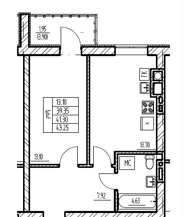 Общая площадь 41.3 м2