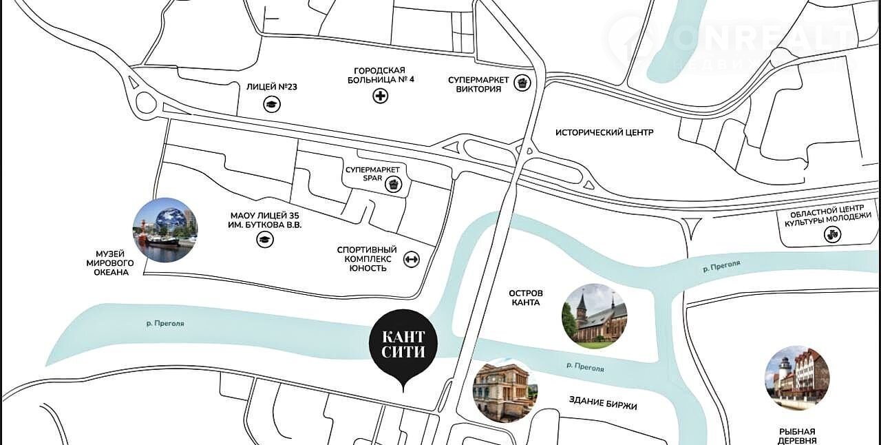В непосредственной близости находятся остров Канта, Кафедральный собор, музей Мирового океана, Фридрихсбургские ворота, живописные набережные, бульвары и скверы, а также множество культурных и развлекательных мест.