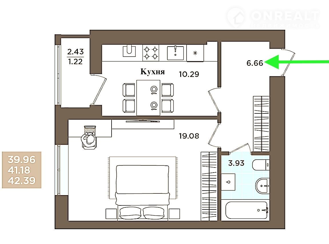 Общая площадь - 42,3 м², без холодных помещений - 40,5 м².