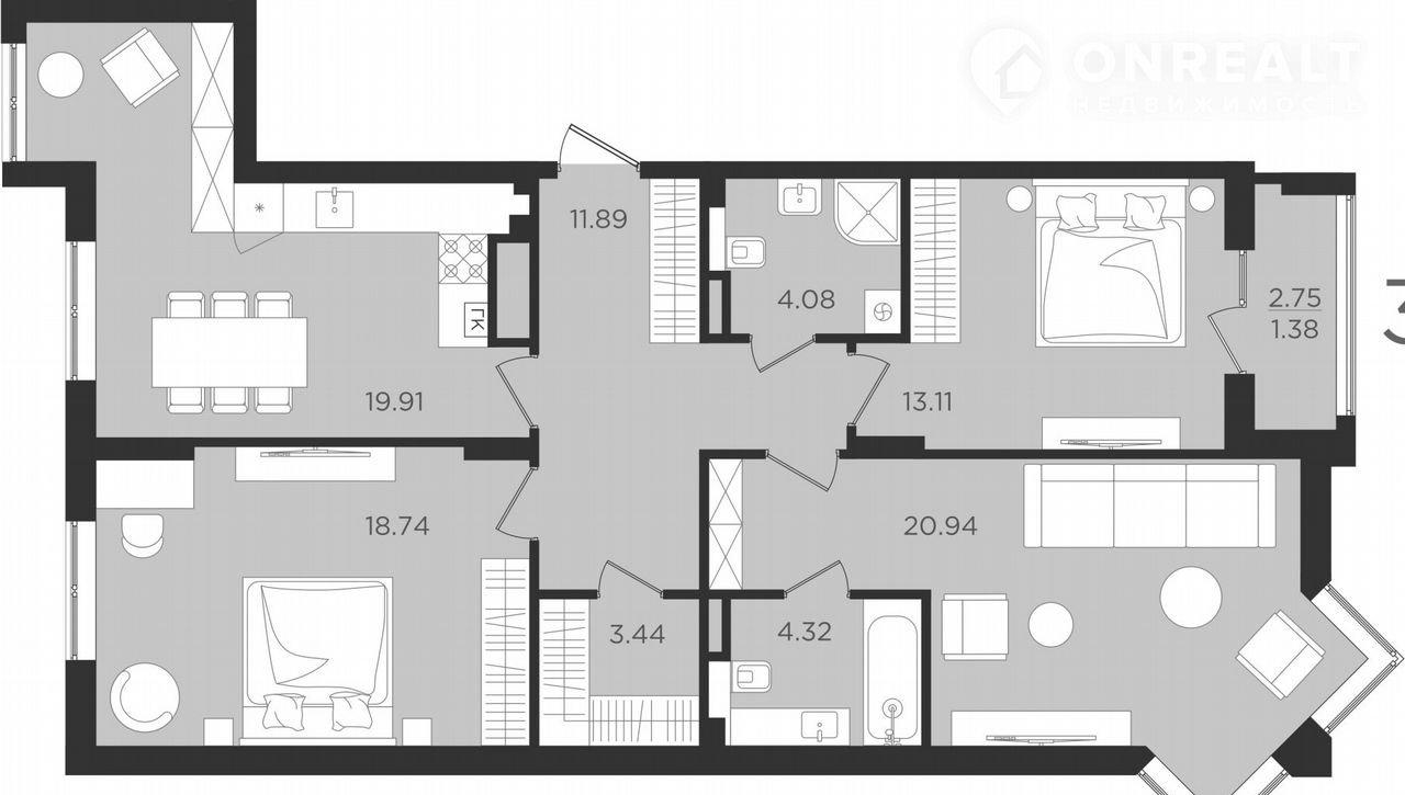 3-комнатная квартира, 99.2 м2, этаж 3 / 9, на продажу в Калининграде