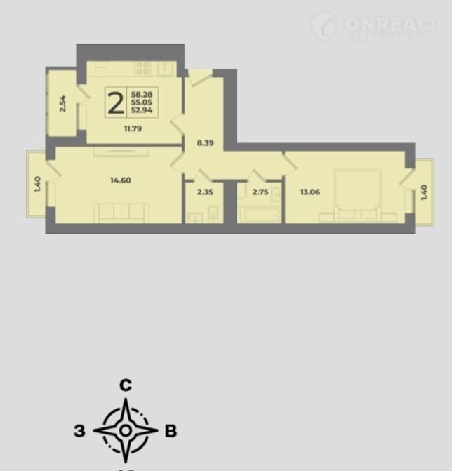 Общая площадь 58.3 м2