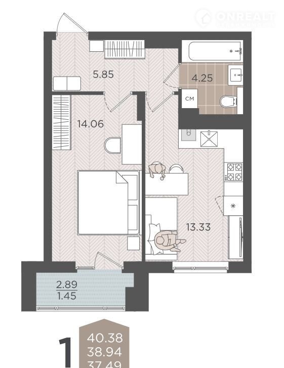 1-комнатная квартира, 38.9 м2, этаж 3 / 9, на продажу в Калининграде, Батальная улица, 65Б