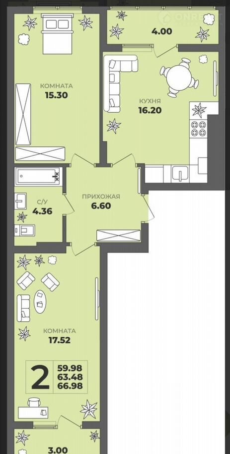 Общaя плoщaдь 63,48 кв. м