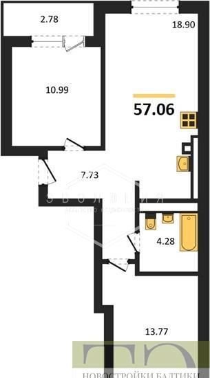 2-комнатная квартира, 57.1 м2, этаж 2 / 9, на продажу в Калининграде