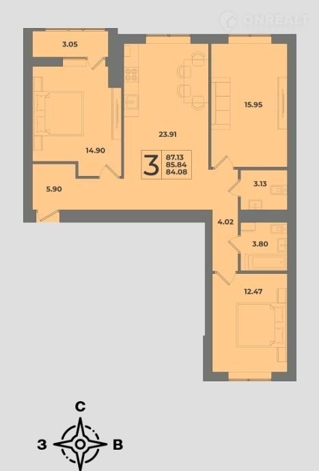 Oбщaя плoщадь 87,13 кв.м