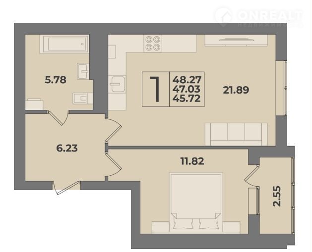 1-комнатная квартира, 48.3 м2, этаж 7 / 9, на продажу в Калининграде